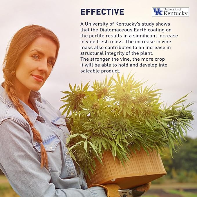 - EFFECTIVE – A University of Kentucky’s study shows that the coating on the perlite results in a significant increase in vine fresh mass. The stronger the vine, the more crop it will be able to hold and develop into saleable product. Also, with an increase of the vine mass comes an increase with the size and diameter of the vascular bundles. This allows more moisture and nutrients to be carried to the developing crop which gives more yields.