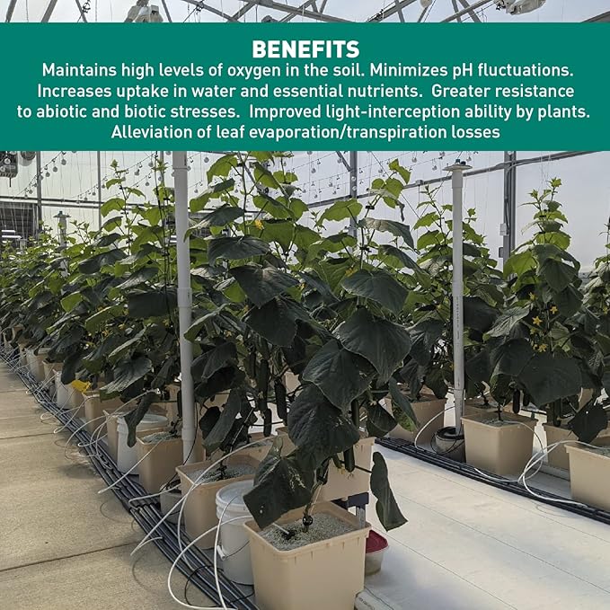 - BENEFITS - Maintains high levels of oxygen in the soil. Minimizes pH fluctuations. Increases uptake in water and essential nutrients. Greater resistance to abiotic and biotic stresses. Improved light-interception ability by plants. Alleviation of leaf evaporation/transpiration losses.