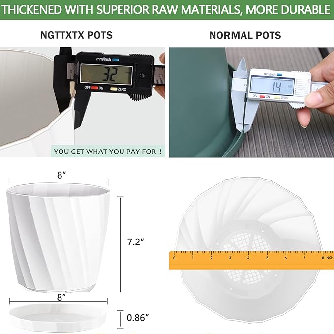 - THICKENED AND DURABLE: 5 White pieces per set. Size: 8"D * 7.3"H. The thickness of the planter is 3.2 mm, it is 2-3 times that of ordinary plastic planters. They are so strong, resistant to falling and compression, not easy to age, and durable. You get what you pay for
