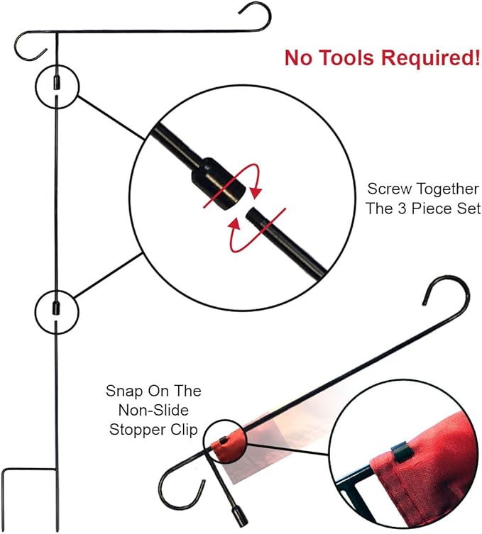 - No Tools Needed Set has 13 in x 18 in Garden Flag and 17.5" (w) x 36.5" (h) Assembled Sized Garden Flag Stand