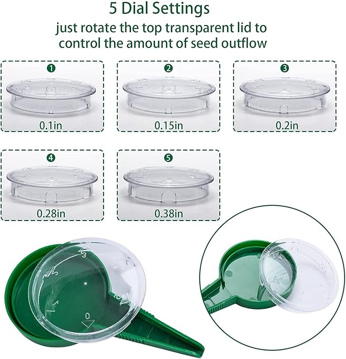 - 🌱《Seed Dispensers 》Giveaways a little seeding assistant,There are 5 different size outlets, simple design allows you to control the flow of seeds through 5 different size outlets.