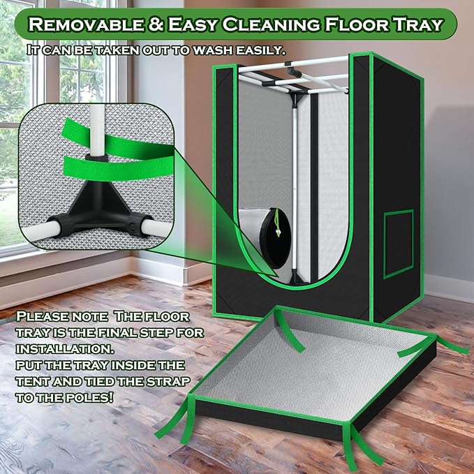 - HIGHLY REFLECTIVE --- The grow tent includes a removable Mylar floor tray, and a 100% light-proof, tear-proof reflective Mylar lining to assist your indoor growing light fixtures and equipment. Increase the intensity of your grow lights and retain heat to keep your grow room at the right temperature for your plants, herbs, flowers, fruits, and vegetables to thrive