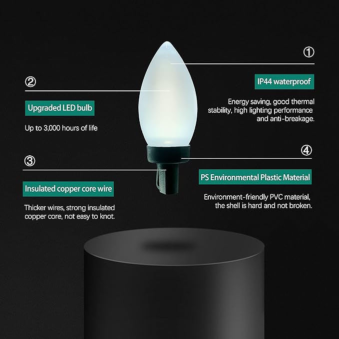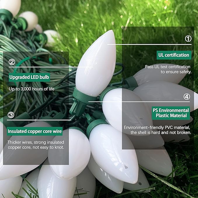 - [Intimate design] Suitable for occasions of various sizes, the total length of a string of lights is 34.5 feet, light length 32.5 feet, the length of the front plug is 20 inches, and the tail plug length is 8 inches. the distance between the bulbs is 8 inches, the height of the bulb is 2 inches, the width is 1 inches.