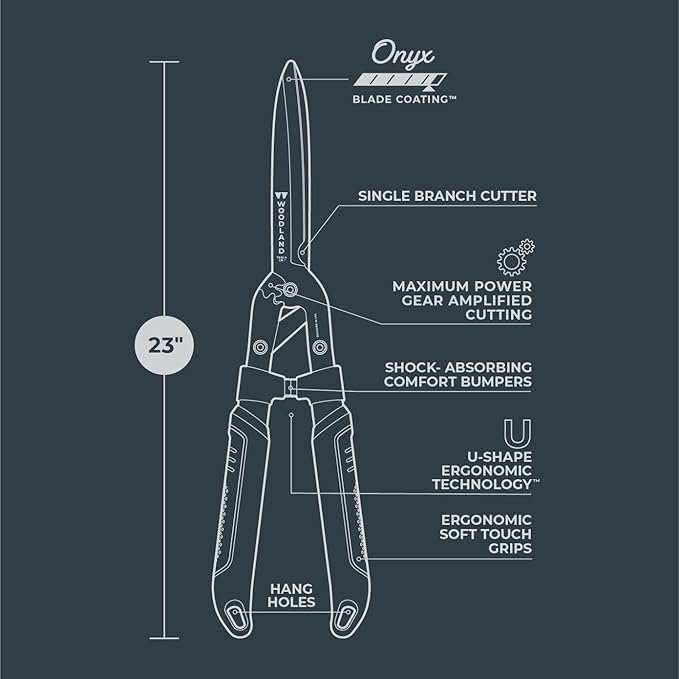 Woodland Tools Co. Super Duty MaxForce Hedge Shear – 23" High Carbon Steel Blades with Gear Amplified Cutting Power, Ergonomic U-Shape Design