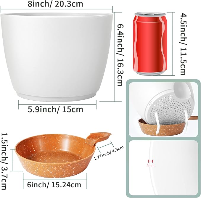 - 【Size of Planter Pots】Each plastic pot is 8” in Opening Diameter, 6” in Bottom Diameter, 8” in Height. these planters are great for decorate windowsill, desktop, shelf, bedroom, living room, kitchen, garden, office, etc.