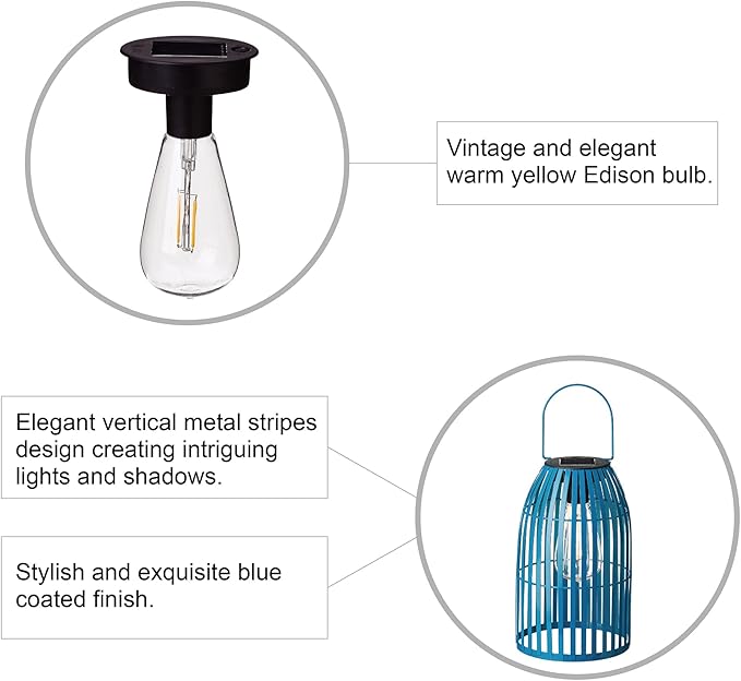 - 【Solar Powered Lantern】 Traditional farmhouse hanging lantern design, novelty birdcage shape main body and warm yellow Edison bulb. This Solar Lantern can be hung on anywhere you want, perfect for garden, yard, patio, porch, wall, pathway, driveway, lawn, camping, trees, pergolas, etc. outdoor solar landscape lighting and decoration.