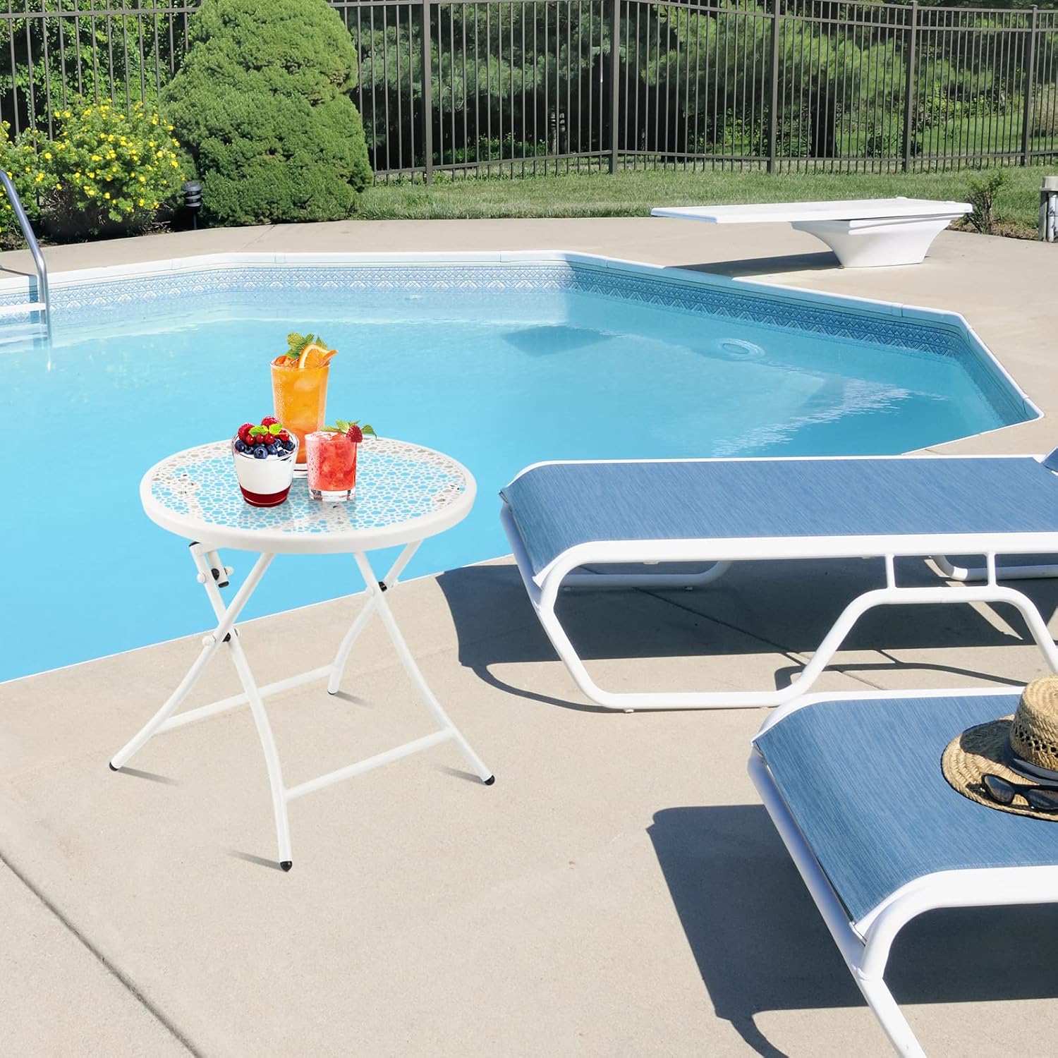 TeoKJ Folding Outdoor Side Tables, Anti Rust Small Patio Table Round Metal Nightstand with Flower Cutouts for Porch Yard Balcony Deck Lawn, White
