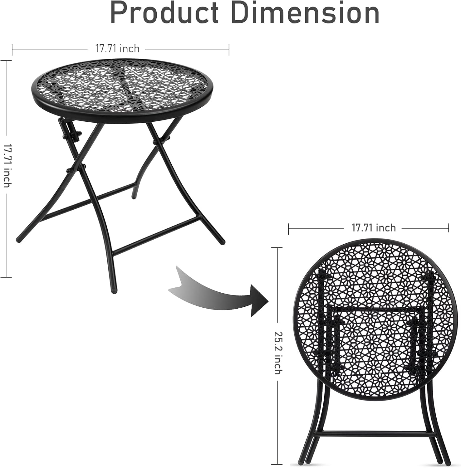 - Saving Space: The table size is 17.71" (D) x 17.71"(H). The folding thickness is 2.36" and folding height is 25.2". It’s super easy to be stored under a bed and sofa, or behind the door and against the wall. This foldable table is easy to move and carry