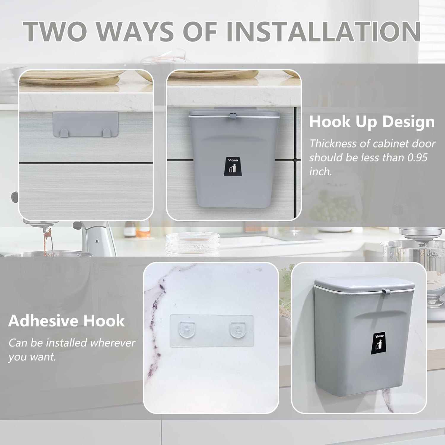 - Flexible Installation: Trash bin is easy to install hanging, it includeds 1 hook and 1 adhesive hook. Small and perfect fit for most cabinet doors, pantry doors, cupboard; The thickness of the door should be less than 0.95 inch(2.5 cm)