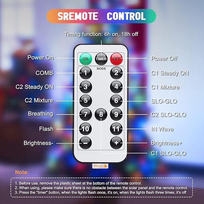 - SMART REMOTE CONTROL: Turn on/off the lights, 4-level (100%-75%-50%-25%)adjustable brightness, switch between 11 lighting modes, and timing functions on/off. All functions can be operated through remote control, which is very convenient and fast, allowing you to easily embellish your life all the time. NOTE: Please remove the insulation sheet before use, and there is no obstacle between the solar panel and the remote control.