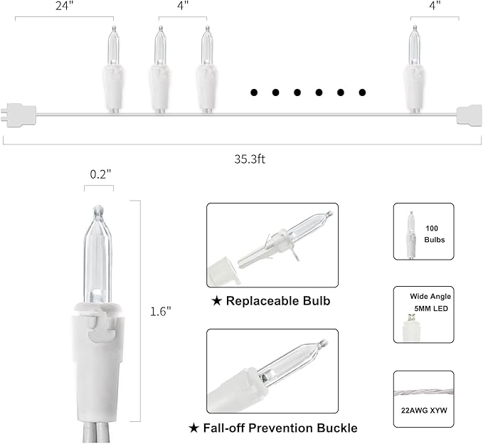 - 【Mini LED Christmas Lights Specification】: 2 Sets - white wire christmas string lights includes 100 count warm white led lights, total length 35.3ft, lights length 33ft and each led is 4 inches apart, 24 inches lead wire, 4 inches end connector (Extra 2 x replacement bulbs and 2 x fuse included)