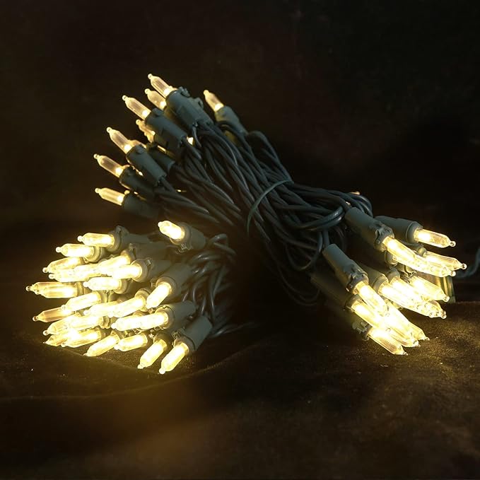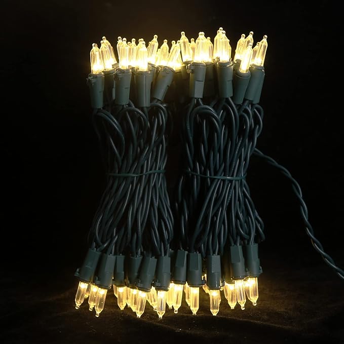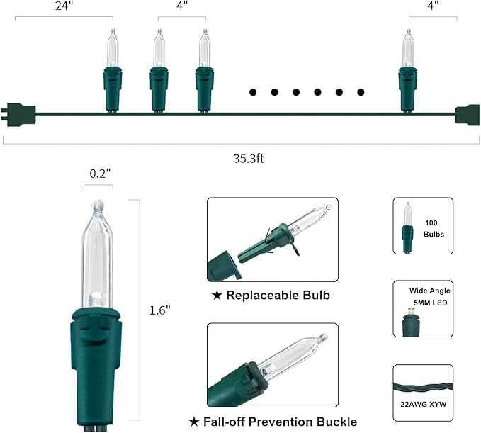 - 【Mini LED Christmas Lights Specification】: 2 Sets - green wire christmas string lights includes 100 count warm white led lights, total length 35.3ft, lights length 33ft and each led is 4 inches apart, 24 inches lead wire, 4 inches end connector (Extra 2 x replacement bulbs and 2 x fuse included)