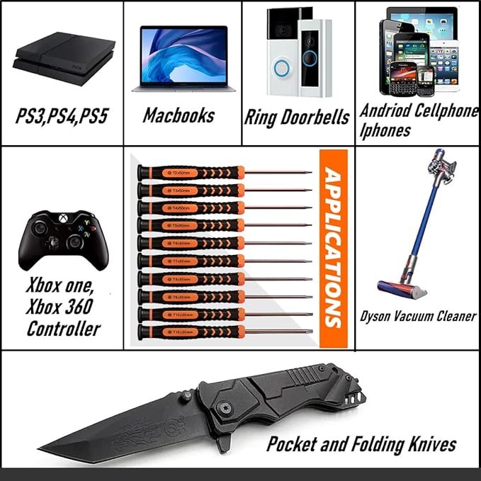 - [WIDELY APPLICATIONS]: Widely used for Apple macbook, iphone, xbox controller,PS3,PS4,laptop,computer, game consoles,Mac mini,pocket knife,ring doorbell,dishwashers,shavers,routers and many electronic devices with torx screws.