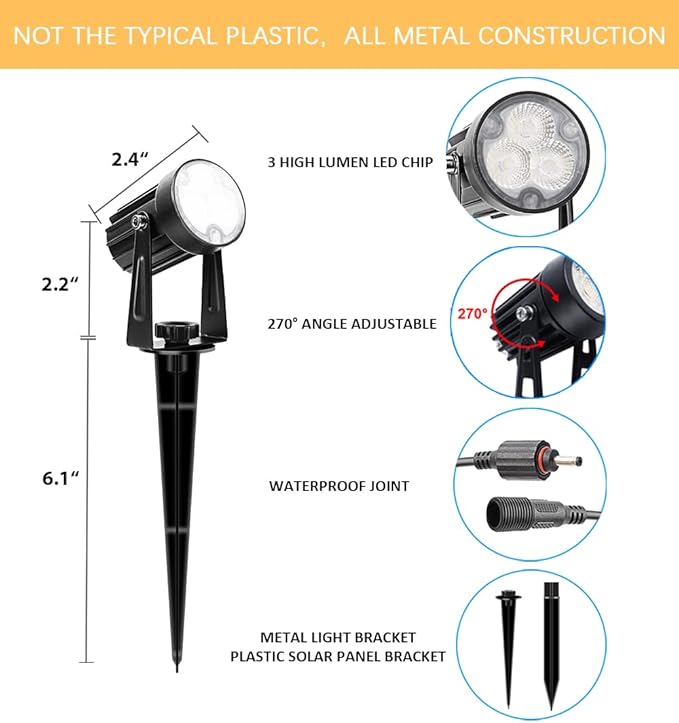 - 【2 installation methods】Easy to install:The solar panel and outdoor solar landscape lights can be installed in the ground or mounted on the wall with included screws. Each solar garden spot lights with 118inch/3m cable, 270° Adjustable freely up or down to meet different requirements