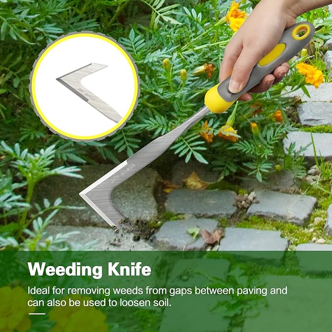 - Garden tools set: 8 pcs gardening tools includes trowel, transplanter, hand rake, weeder, pruning shears, weeding knife, garden gloves and storage tote bag. Suitable for digging, loosening soil, transplanting, aerating, planting, weeding and more