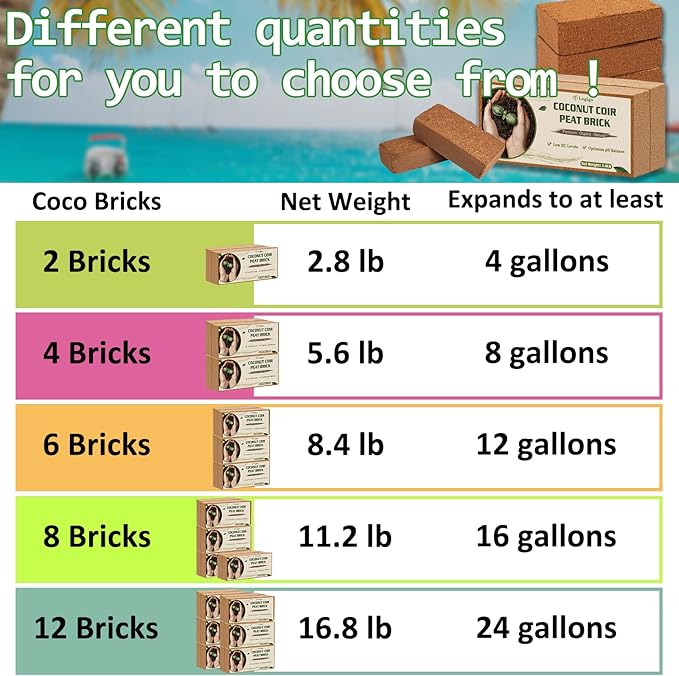 - Coco Coir Growing Medium: This low EC, PH balanced biodegradable soil is made from crude fiber extracted from the husk on coconut husks, 100% natural organic and sustainable, a traditional soil alternative, it can take your gardening and planting efforts to a new level; 12 Pack, each brick is: 8 x 4 x 2 inches, weight 1.4 lb