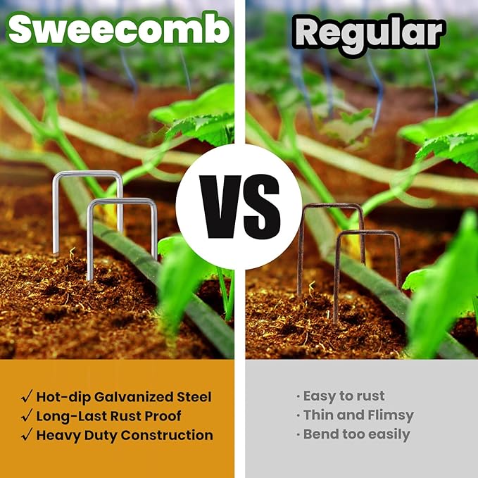 - MATERIAL: Our landscape fabric stakes are made of anti-rust durable galvanized steel. Strong enough to insert into the ground with adjustable width. The garden staples can be used for a long time.