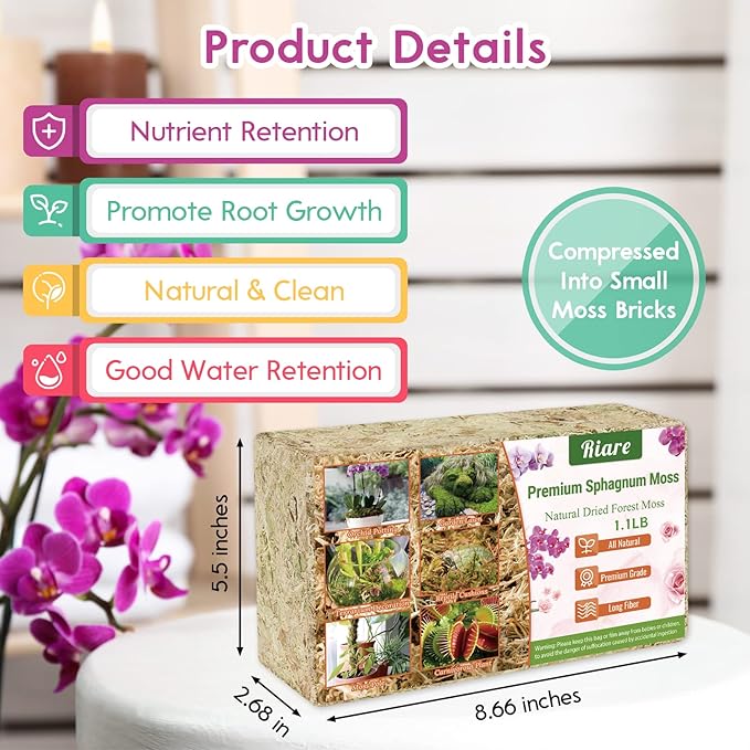 Riare 1.1 LBS Premium Sphagnum Moss- Natural Long Fibered Sphagnum Peat Moss Plants Moss Dried, Carnivorous Plants Moss Orchid Potting Mix for Orchids, Succulent, Reptiles (20QT)