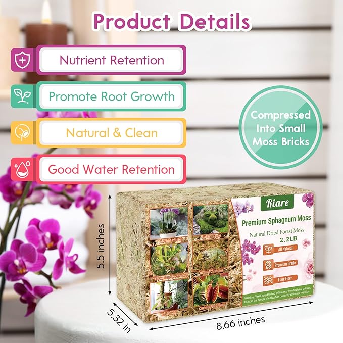 Riare 2.2 LBS Premium Sphagnum Moss for Plants- Natural Long Fibered Sphagnum Peat Moss Plants Moss Dried, Carnivorous Plants Moss Orchid Potting Mix for Orchids,Carnivorous Plants,Succulent(40QT)