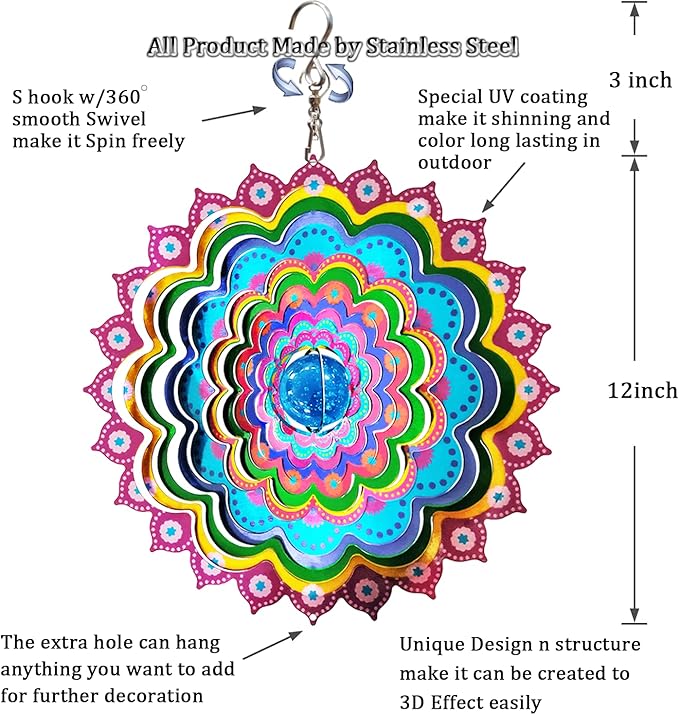 - 【<b>Vivid reflective color<b>】wind spinners are individually hand painted by epoxy protective coating with colorful sparkle powder inside to highly resist weather and rust. -Meanwhile,the reflective colorful glitter material gives off a sparkling, captivating and magical 3D visual effect, its beautiful light reflecting and attractive view whatever in night or day, wherever room or garden.