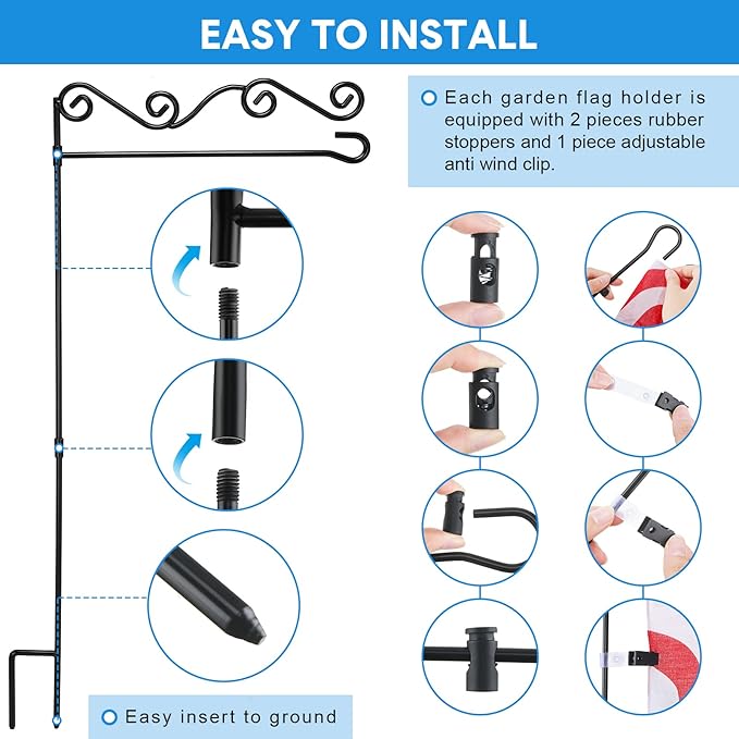 - Weather Resistant and Sturdy: the garden flag stand is made of metal, with thickened grounding rod and reinforced welding point, which is stable and sturdy, not easy to bend or break, with the black powder coating, which is weather resistant and rust proof