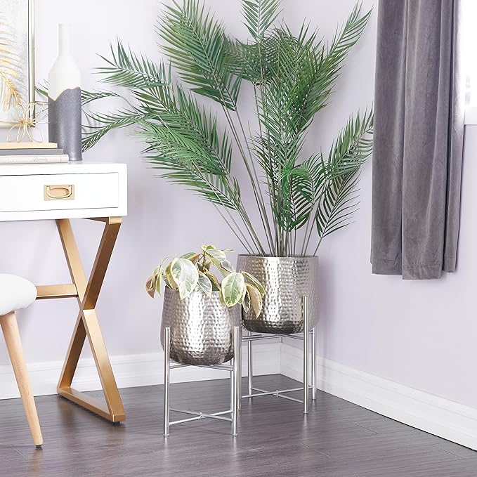 - FEATURES ROUND PLANTER: These silver metal planters accentuate cylindrical hammered metal pots in classic silver finish with round bottoms as well as stands with x-shaped supports