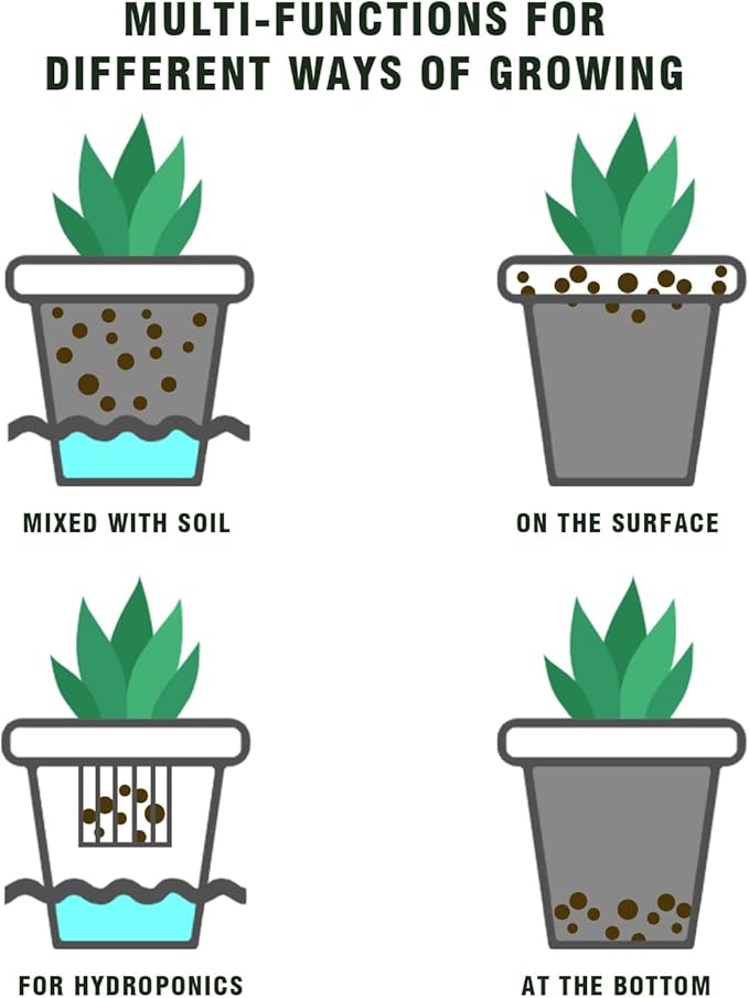 - Soil Conditioner : Our Clay pebbles for plants is perfect grow medium for all horticulteral applications. Lightweight , not broken after soaking, not easy to blow away, inert, pH-neutral, and clean. Soil Amendment to aerate, reduce compaction, and improve drainage in heavy soils.