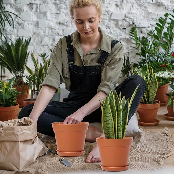 WOUSIWER 16 Pack 6 inch Plastic Planters, Plastic Indoor Planter Flower Pots, Heavy Duty and Stylish 6 Inch Plant Pots for Indoor Plants with Drainage Holes and Tray for Plants, Flowers, Terracotta