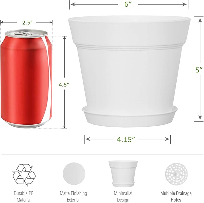- 【Most repotting for Indoor Plants】 This 6inch Plant pot set includes 16 pieces planting pots and 16 pieces of the matching trays are great for repotting plants, you can grow a variety of plants indoor or outdoors, such as orchid, snake plants, mint, parlor palm, devil’s ivy, cactus, aloe