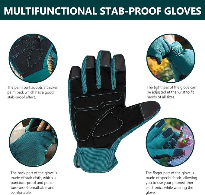 - GARDEN GLOVES: This glove is made of super-dense fiber and stair fabric, comfortable, abrasion resistant, puncture & tear resistant. The palm part of the hand is made of thicker palm padding for good puncture resistance. The back is made of stair fabric, breathable and comfortable. The finger part is made of unique material, so you can use your phone or other electronic devices while wearing the gloves. This is a Size L glove, so it fits most men and is also ideal for heavy gardening work.