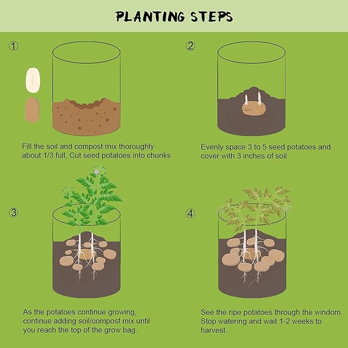 - Easy to Store and Reuse: The bags can be easily fold up and won’t take up much space when storing. Easily move and flap the lid to harvest potatoes without much effort. Please put about 4 to 6 seeds in each bag. At the end of the growing season, you may empty the bags, simply clean them and store dry.