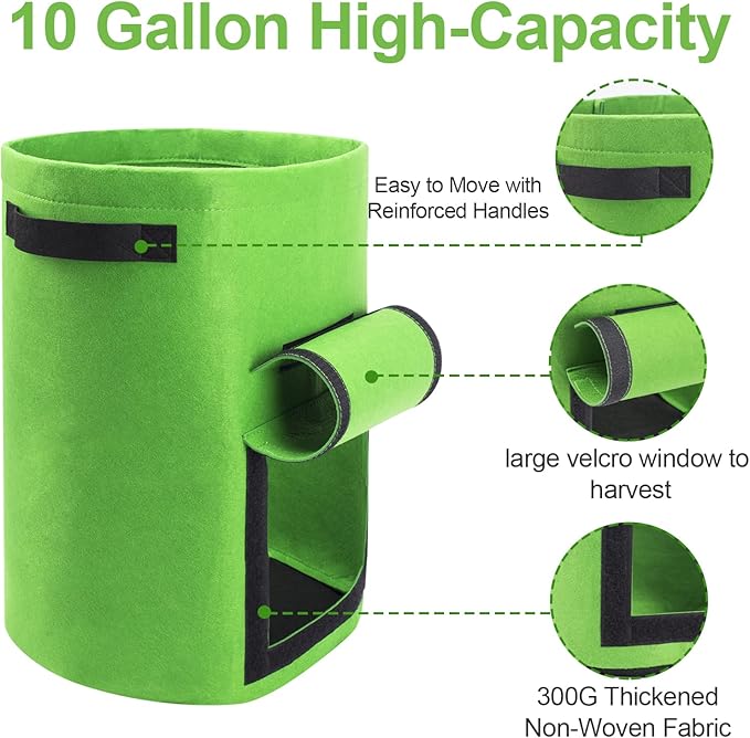 - Premium Material: Made of breathable double layer non-woven fabric, material is heavy duty felt, the potato growing bag ensures good ventilation to prevent excessive moisture, also provide more oxygen for your plants. The strong and biodegradable material can prolong the service life of the bags, at the same time cause no pollution.