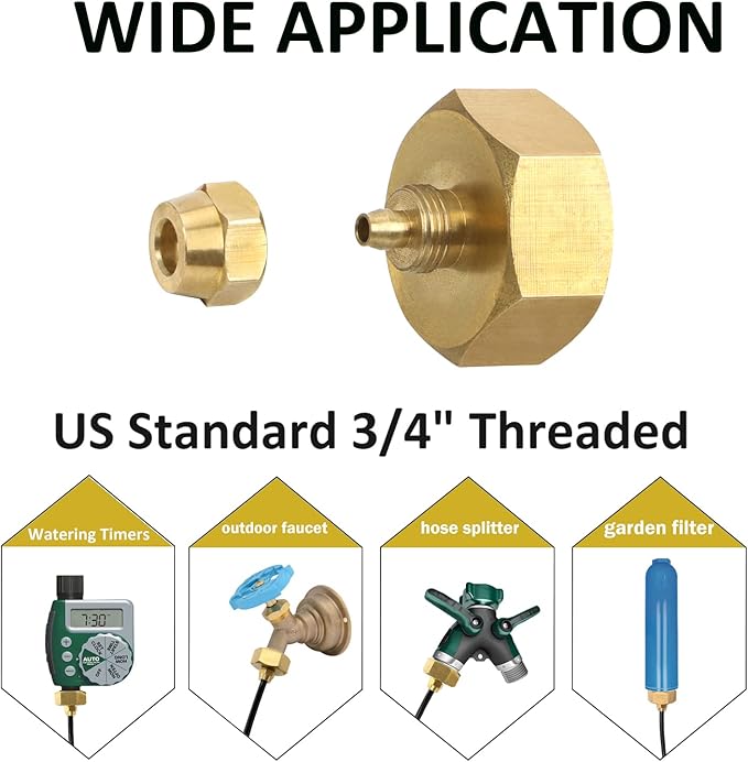 - SUITABLE FOR A WIDE VARIETY OF APPLICABILITIES - Converting 3/4" female garden hose thread to 1/4" tubing, this adapter fits a lot of 3/4" male threaded pipe components, like outdoor faucet, hose splitter, garden timer, garden filter, etc. It is a practical applications for garden, greenhouses, flower beds, terraces, and other agricultural irrigation systems.