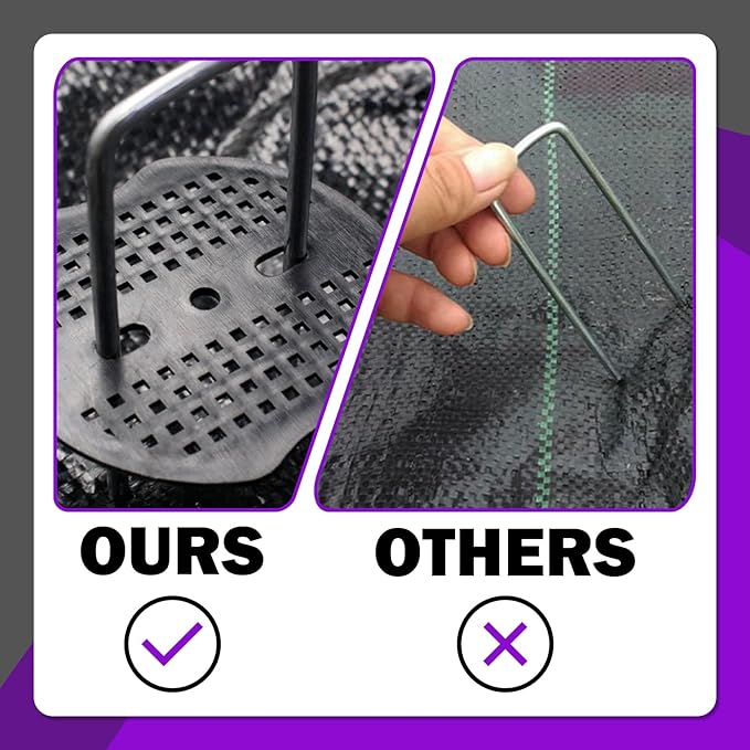 - π‘ Strong Stakes Staples with Good Gasket -------- These are good stakes staples for your garden fabric to hold it in place. The Stakes staples fit well between the gasket and hold down unlike ones without the gasket that can slide up over time. Also comes with a nice hook to pull it back if you want to move or readjust it. Overall, pretty decent set and works well.