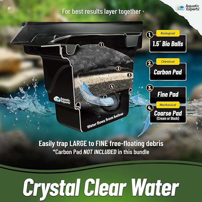 - CRYSTAL CLEAR POND WATER - Place your koi pond filter pad in flowing water such as water being pumped through your pond skimmer box to trap to remove uneaten food, waste, decaying plants, detritus, and other large and fine floating particulates from the water. Changing filter pads regularly will increase water quality by removing solid organic compounds before they continue to break down and add additional nutrients to the water in your pond.