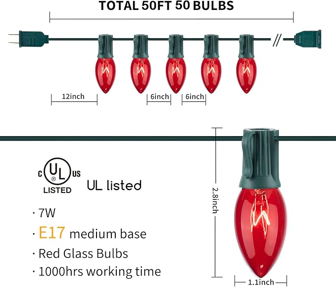 - Christmas string light, 52pc(2 spare) C9 clear red bulbs, 6" lead with male plug, 12" spacing between bulbs, 6" tail with female connector. Lighted Length 49 Feet, total Length 50 Feet