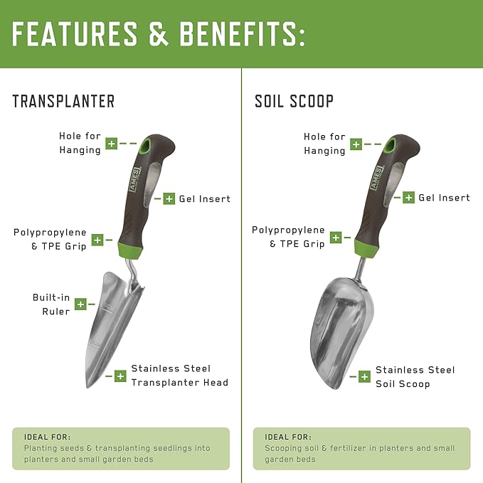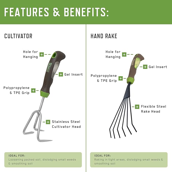 - INCLUDES: Hand Trowel, Hand Weeder, Hand Rake, Hand Transplater, Hand Scoop & Hand Cultivator