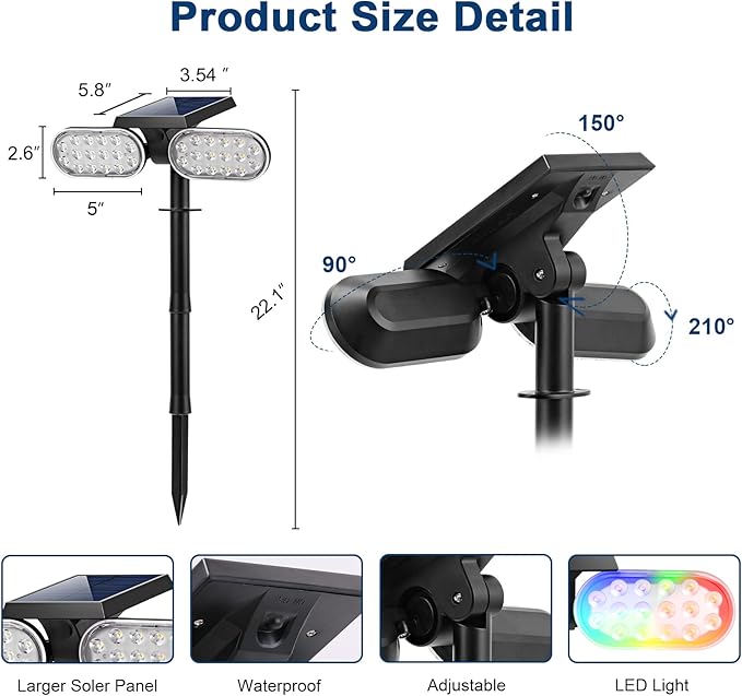 - << Double Heads 210° Adjustable >> Double heads design of our solar landscape spotlights, the lighting area is larger, 210°adjustable no wires to run multicolored solar spotlight, Zero electricity bill.