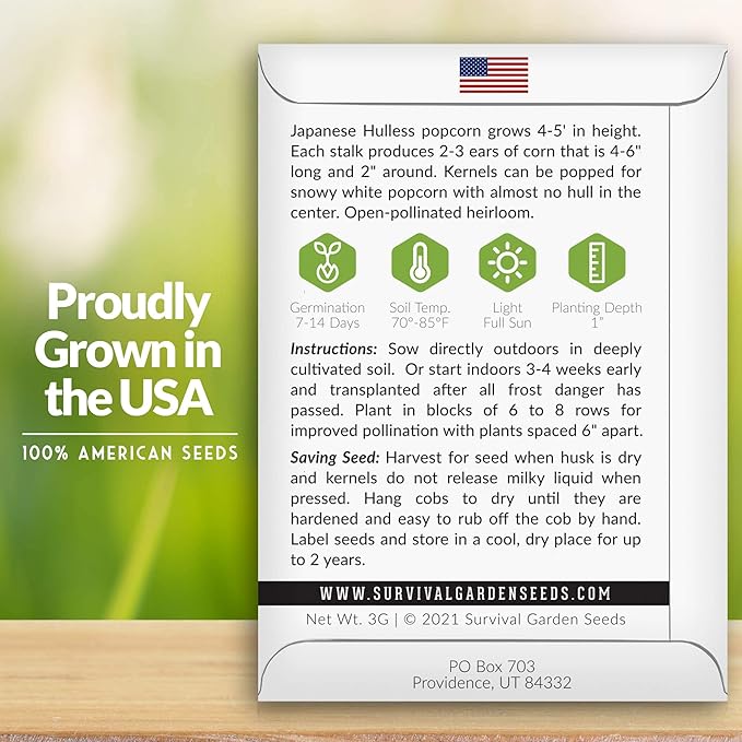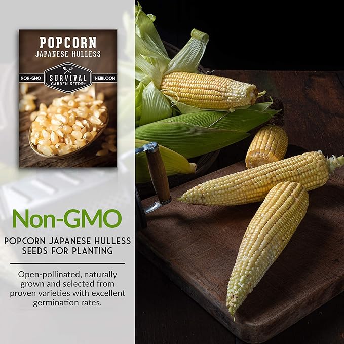 Survival Garden Seeds - Japanese Hulless Popcorn Seed for Planting - 3 Packs with Instructions to Plant and Grow Delicious Kernel Popcorn in Your Home Vegetable Garden - Non-GMO Heirloom Variety