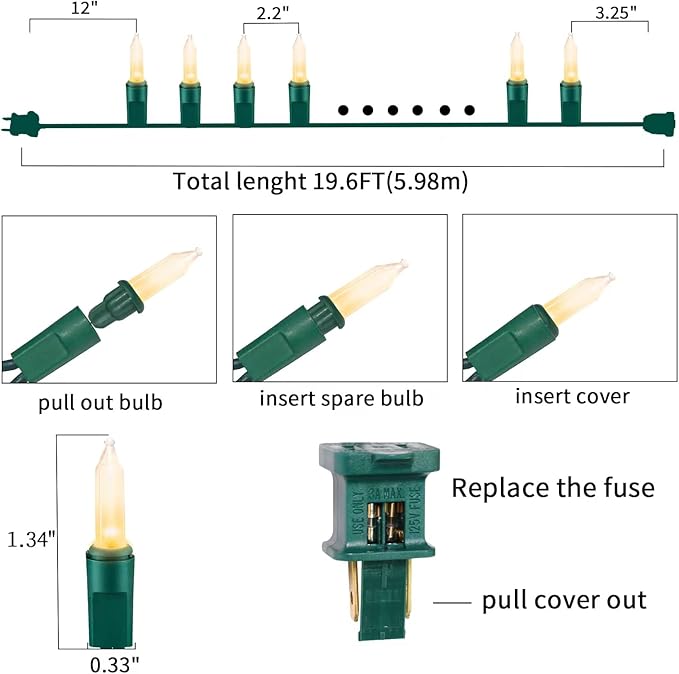 - 【Green Wire Christmas String Lights Decoration】:100L traditional incandescent Christmas light set,19.6Feet Clear(Warm White) Christmas Mini String Lights,each set include 4 Extra Bulbs & 2 Replacement Fuses.Perfect for indoor and outdoor decoration.Plug in,put it where you want,watch and enjoy this light.The light can be reused for many years.