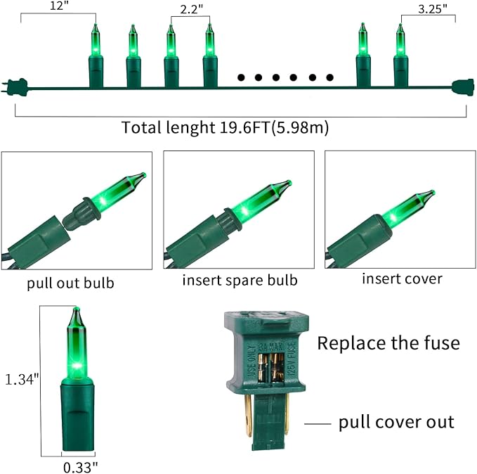 - 【Green Wire Christmas String Lights Decoration】:100L traditional incandescent Christmas light set,19.6Feet Green Christmas Mini String Lights,each set include 4 Extra Bulbs & 2 Replacement Fuses.Perfect for indoor and outdoor decoration.Plug in,put it where you want,watch and enjoy this light.The light can be reused for many years.
