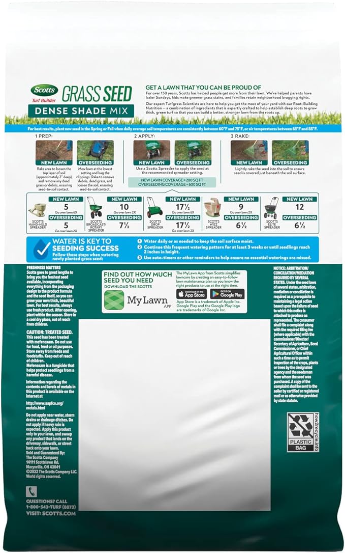 Scotts Turf Builder Grass Seed Dense Shade Mix with Fertilizer and Soil Improver, Grows With Little Sunlight, 2.4 lbs.