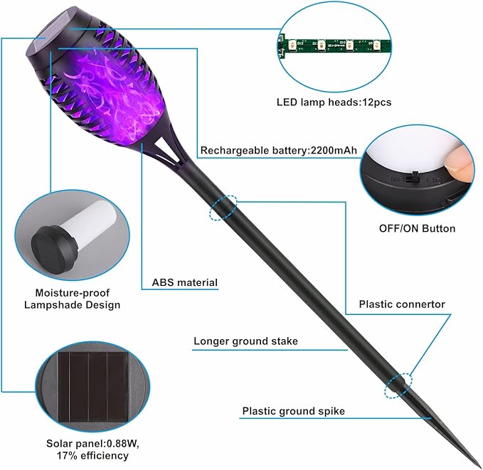 - Easy Installation: No need to install other tools or wires. Attach the flashlight to stakes and nails, just mount the torch solar light anywhere you like and enjoy a truly safe flame.(Note: When using it for the first time, turn on the switch and charge it for at least 8 hours in direct sunlight.)
