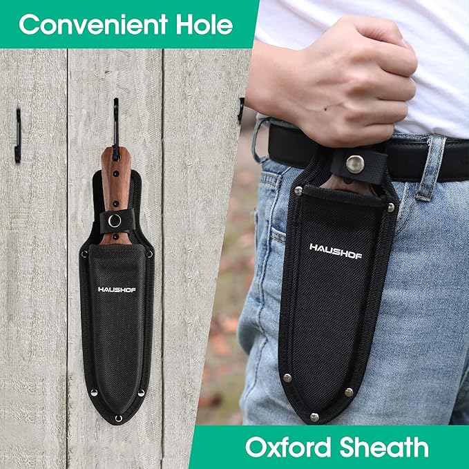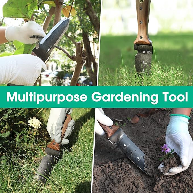 - Convenient Double-edge Blade: The 12.4 ″ versatile HAUSHOF Garden Knife makes gardening, harvesting, or planting an enjoyable thing, not tedious work. The HAUSHOF hori-hori knife has a straight edge and a serrated edge. The individual serrations act as a saw to help you to cut through hard roots, slim tree branches, rope, fertilizer, and feed bags.