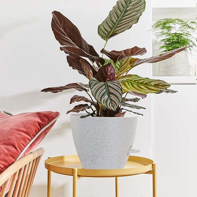 WOUSIWER 10 inch Self Watering Planters, 2 Pack Large Plastic Plant Pots with Deep Reservior and High Drainage Holes for Indoor Outdoor Plants and Flowers, Speckled White