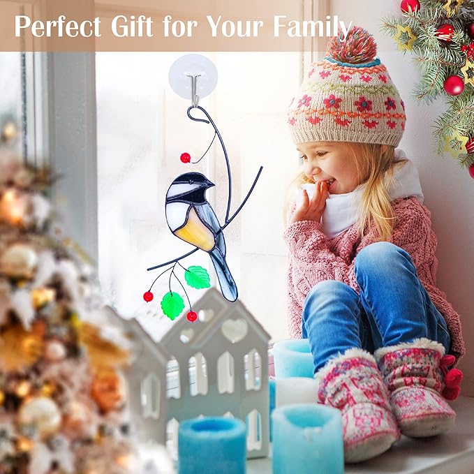 Lolitarcrafts Chickadee Stained Glass Suncatcher Bird Stained Glass Window Hangings for Window Decoration