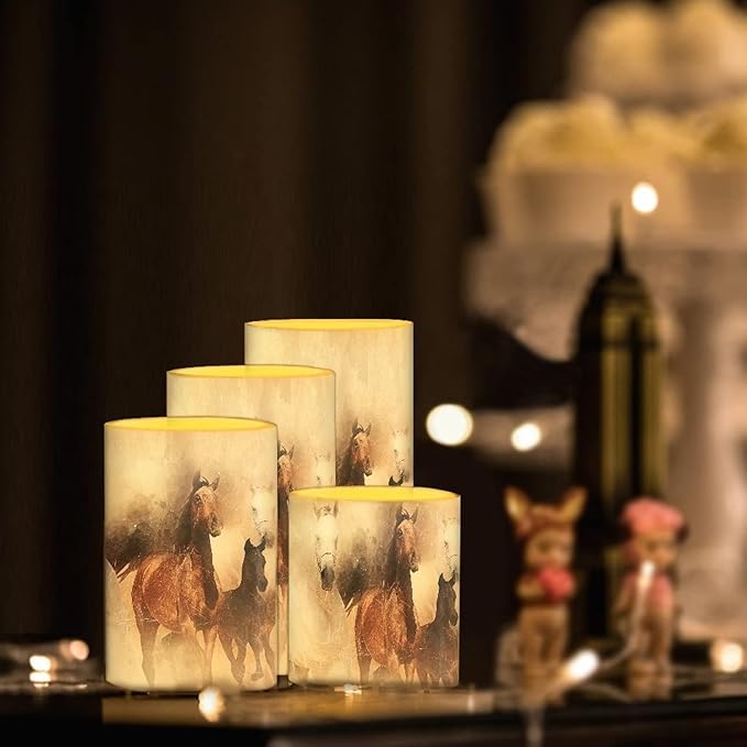 Vintage Running Horse Outdoor Waterproof LED Candles Battery Operated Set of 4 with Timer Remote Colour Changing Pillar Candles for Fall Halloween Decor