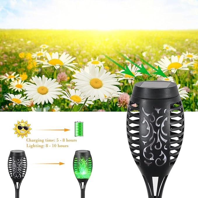 - 【Waterproof & Durable-Solar Torches for Outsideas as Halloween Decor】Our solar light torches uses high-quality waterproof material, this solar lights outdoor waterproof can withstand all kinds of weather all year round. You don't need to worry about rain or snow making the lights get wet. Very suitable for outdoor use. You can place our solar flame lights around swimming pools, gardens, yards, backyards, and trails because it provides beautiful decoration and lighting. Halloween Decorations