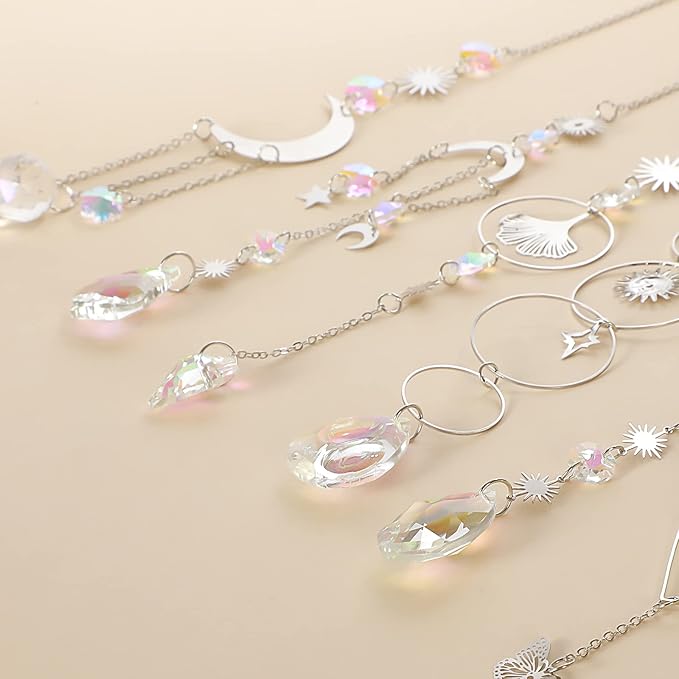 - Sun Catchers Specification: These 6 pieces colorful long chain suncatchers is made out by moon sun metal form frame and clear crystal balls, drops string. Ours are unique designs for decoration. With sun the prism crystal reflectiing, rainbows all around the room