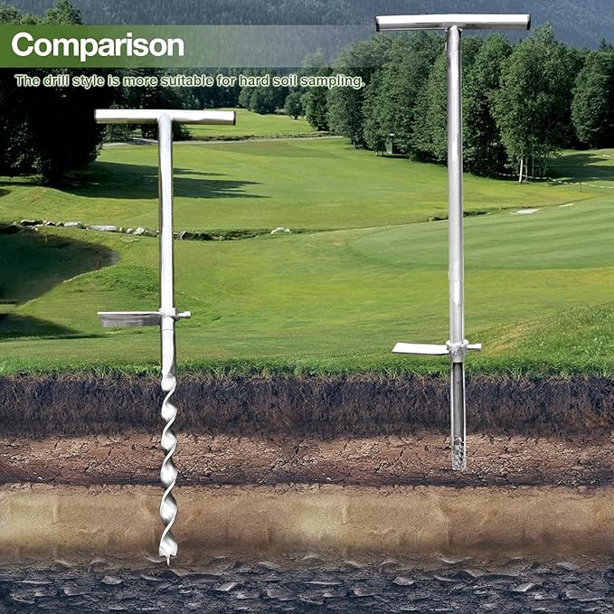 - T-HANDLE, FOOTSTEP AND TWIST DRILL DESIGN: You can easily insert the probe rod with the easy-to-grip10 inches T-handle down deeper into the soil with your foot on the side foot pedal without bending over. Twist drill is more suitable for hard soils